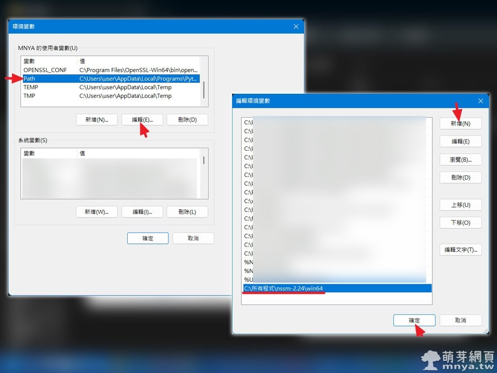▲ 進入「環境變數」視窗後,找到使用者變數中的 Path 變數點「編輯」,在裡面新增剛才存放 NSSM 的資料夾路徑,最後按下「確定」完成儲存。(每個視窗關閉前都要點「確定」)