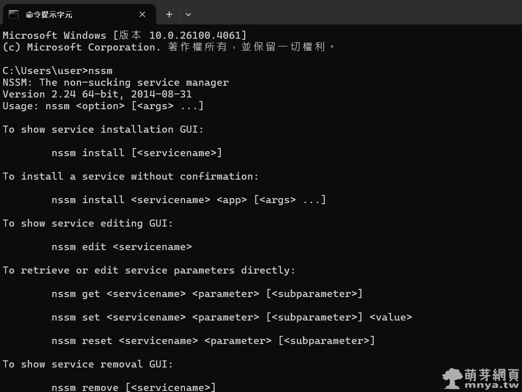 ▲ 設定完畢後,打開命令提示字元,輸入 nssm,若看到 NSSM 的指令列表,代表已經可以在任意路徑直接執行 NSSM 指令囉!