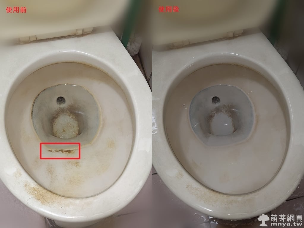▲ 馬桶使用前後對比,關於紅框處頑強的水垢與尿垢平常怎麼刷都刷不掉,特別針對該處進行劑量加倍及靜置半小時後才刷洗(共兩輪),效果顯著,沒有白花這筆錢了,其他部份日後再找時間局部清理,畢竟都陳年汙垢了,簡單刷洗是不夠的。