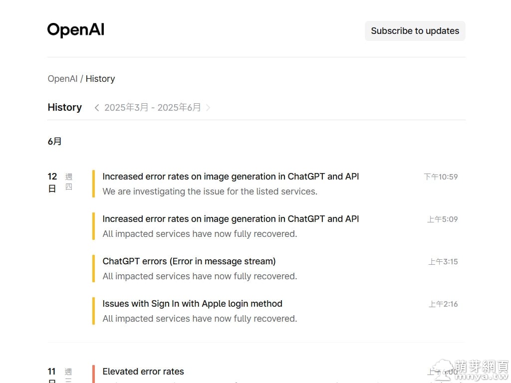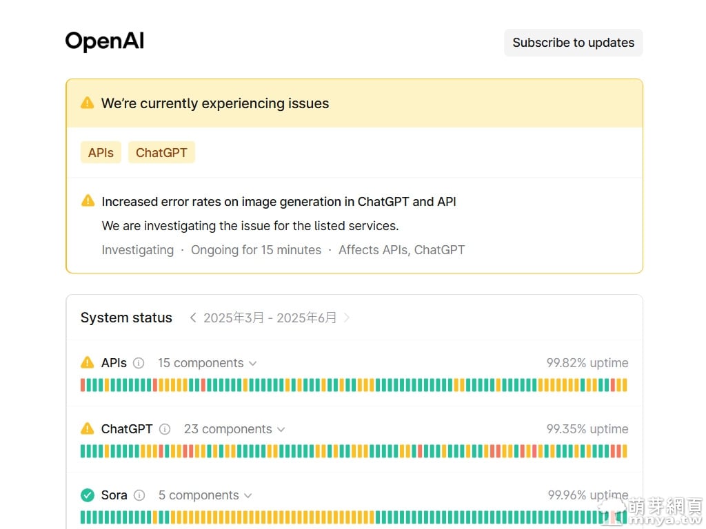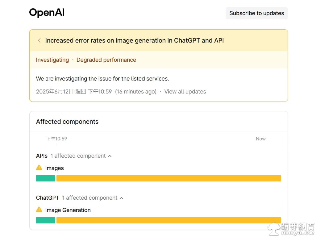 ▲ OpenAI 官方狀態頁面顯示,目前 ChatGPT 及 API 的影像生成服務錯誤率升高,正積極調查中。使用者可以點擊訂閱按鈕,隨時接收最新服務狀況更新。