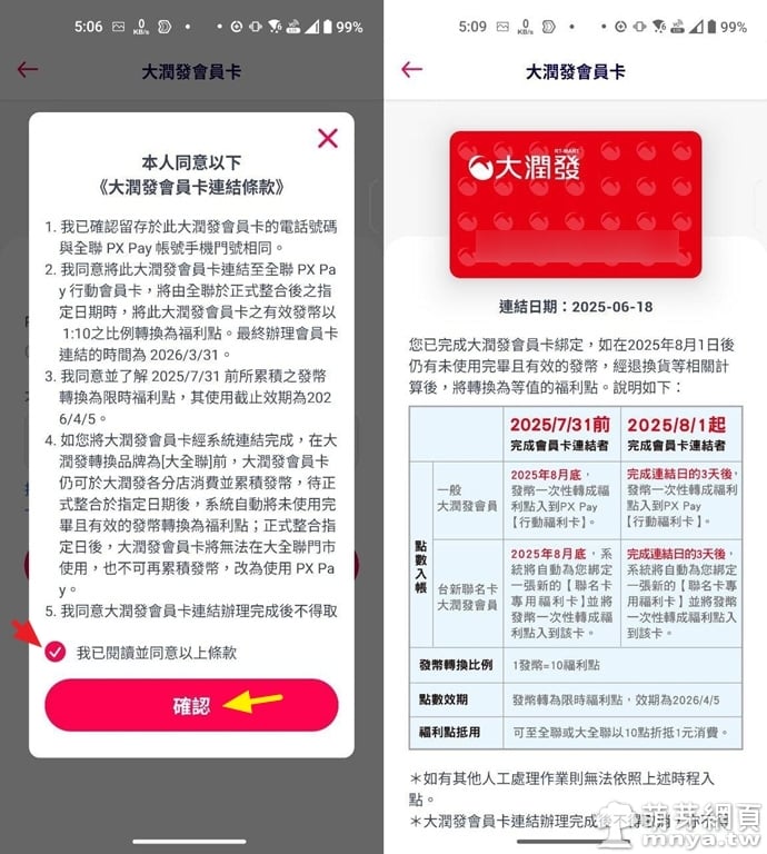 ▲ 閱讀並勾選同意相關條款後完成連結,畫面會顯示連結日期與福利點轉換說明,確保權益順利延續。