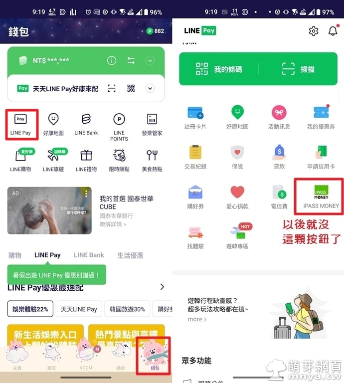 ▲ 左:舊版 iPASS MONEY 需先進入 LINE App 的「錢包」分頁,再點入「LINE Pay」服務。右:在 LINE Pay 服務中會有 iPASS MONEY 的按鈕,用戶點擊後可進入 iPASS MONEY 功能。新版上線後,這顆按鈕將消失,需改用 iPASS MONEY App。