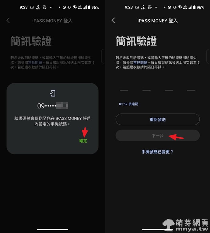 ▲ 左:手機接收驗證簡訊碼。右:收到驗證碼後輸入即可點「下一步」。