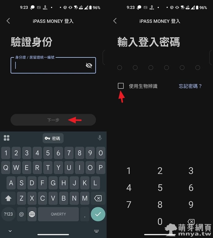 ▲ 左:驗證身份時,需輸入身分證或居留證字號確認。右:接下來輸入你的 iPASS MONEY 登入密碼,也能選擇啟用生物辨識,方便日後快速登入。