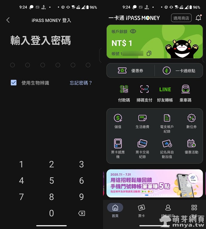 ▲ 左:啟用生物辨識後,下次登入時可直接使用指紋或臉部辨識解鎖,無需每次輸入密碼,但現在仍要輸入一次登入密碼。右:成功登入 iPASS MONEY App 後,即可看到帳戶餘額與各項服務,原本在 LINE Pay 的功能全部移轉,操作介面也更為完整。