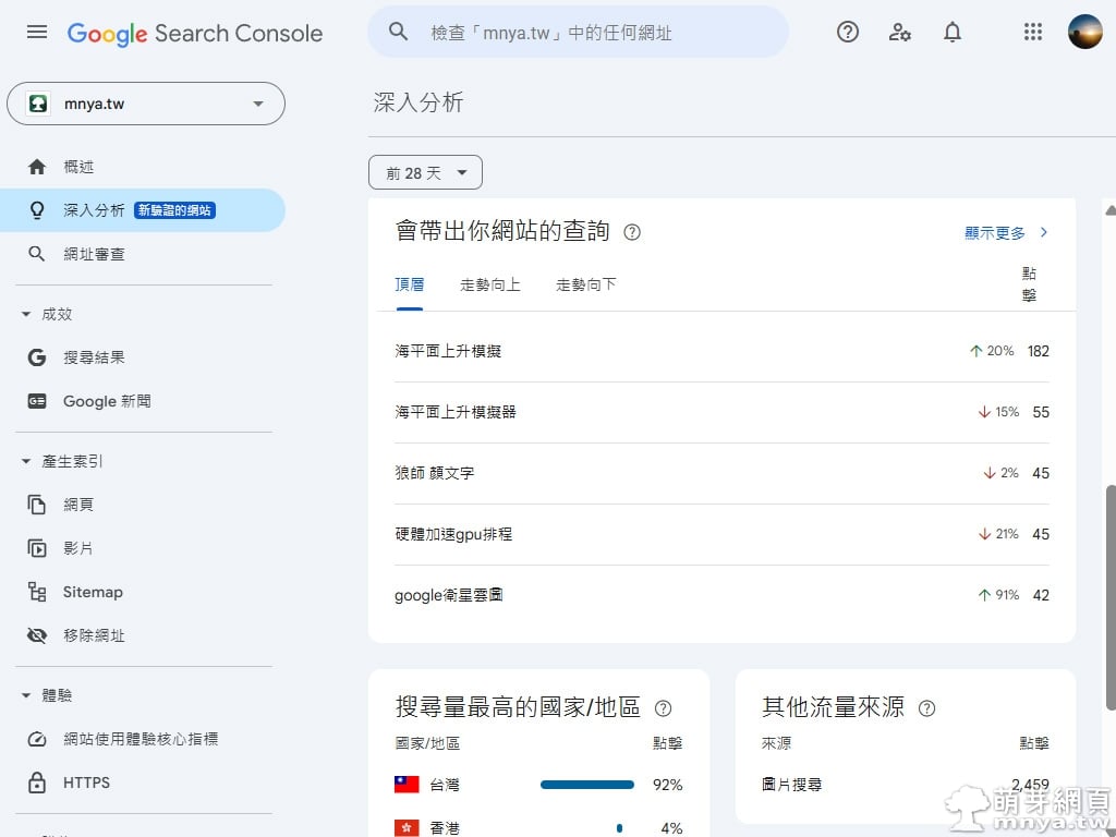 ▲ 往下可以看到帶來網站流量的熱門搜尋查詢,包含點擊次數變化,以及最大流量來源的國家/地區分布。新版深入分析讓你更容易了解哪些關鍵字正帶動網站流量成長,並鎖定目標市場。