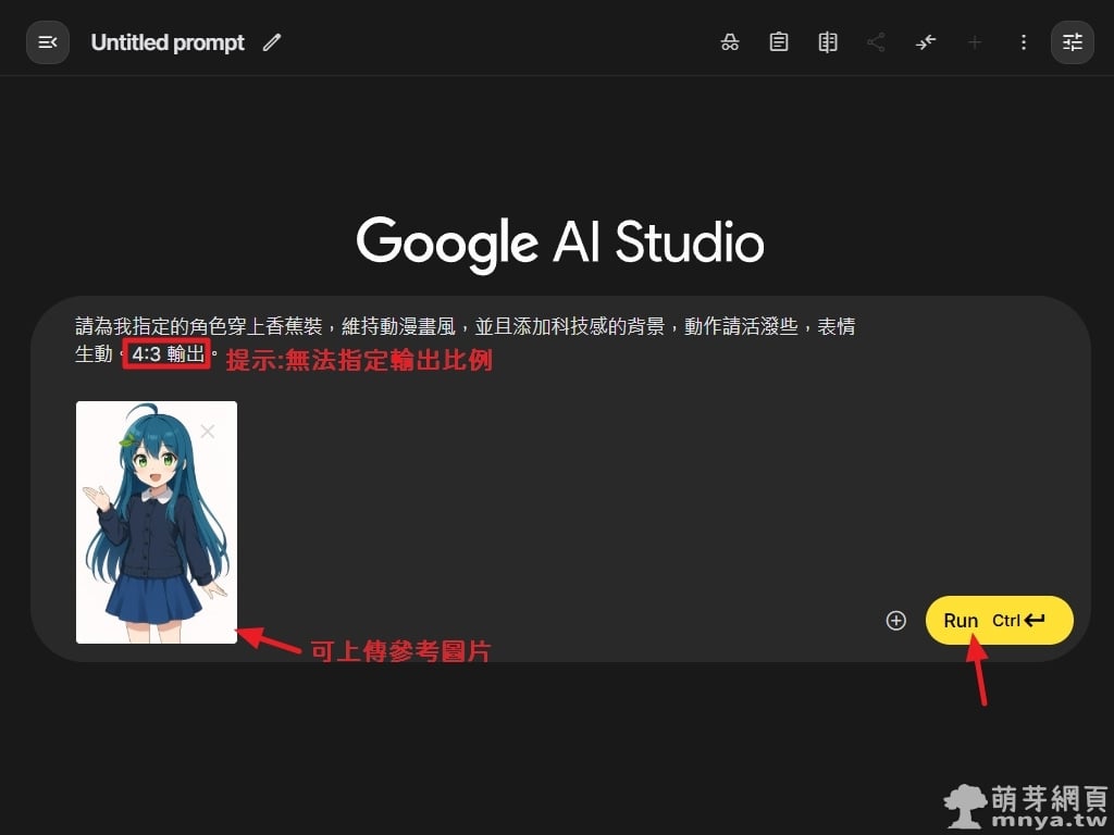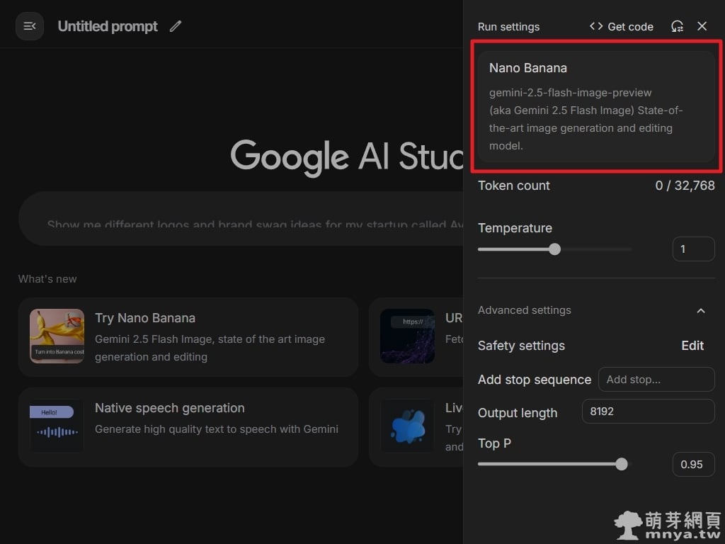 ▲ 這是 Google AI Studio 的模型設定介面,確保右上角已切換為 Nano Banana,也就是 Gemini 2.5 Flash Image,具備「快速回應、低延遲」的特性,非常適合互動式生成與商業應用。