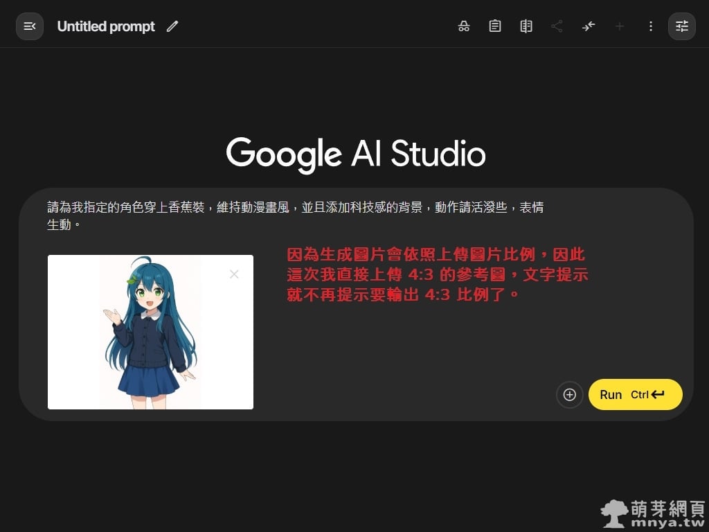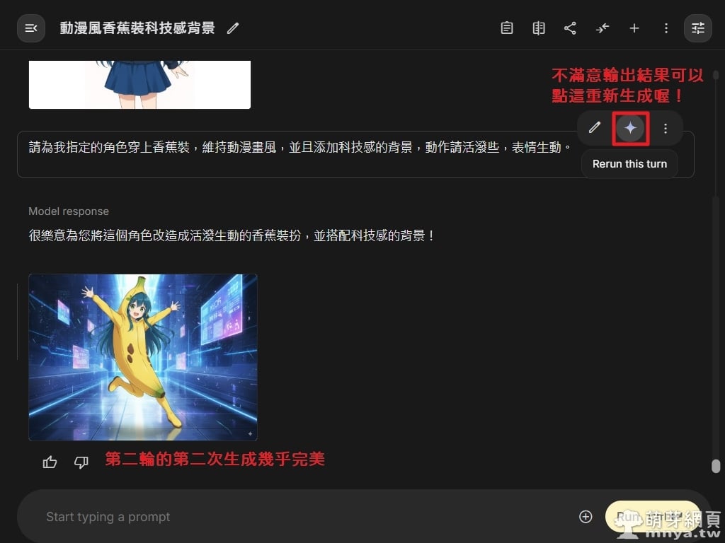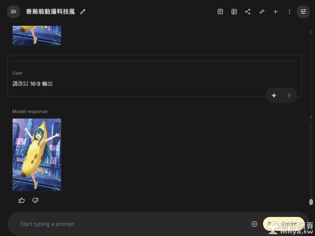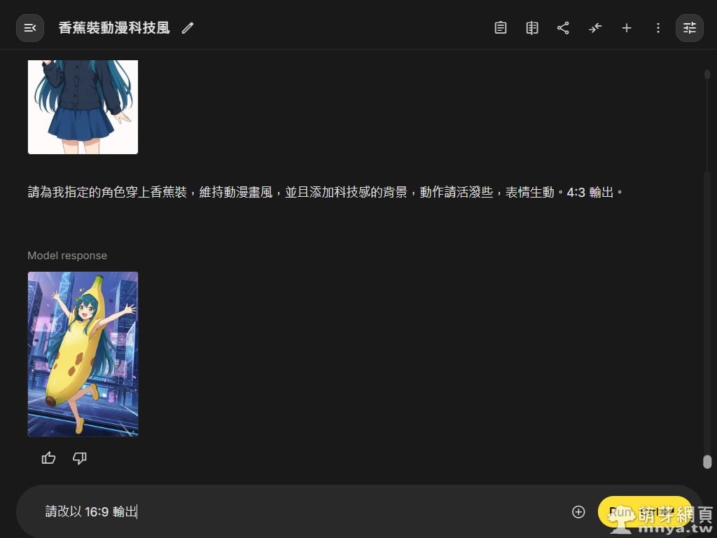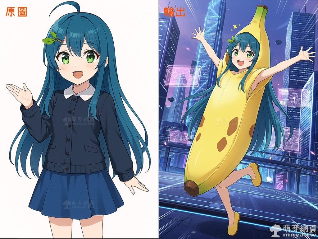 ▲ 最終成果展示了角色換上香蕉裝後(接近)4:3 的完整畫面,搭配充滿未來感的背景,生動呈現動漫畫風的特色,幾乎可直接用於創作或行銷了,相當厲害,以我這張來說只重試了一次,生成速度真的超快,以速度來說完全勝過 ChatGPT 圖像生成工具,甚至角色還原度我都體感認為比 ChatGPT 圖像生成工具好太多,Google 太神了。