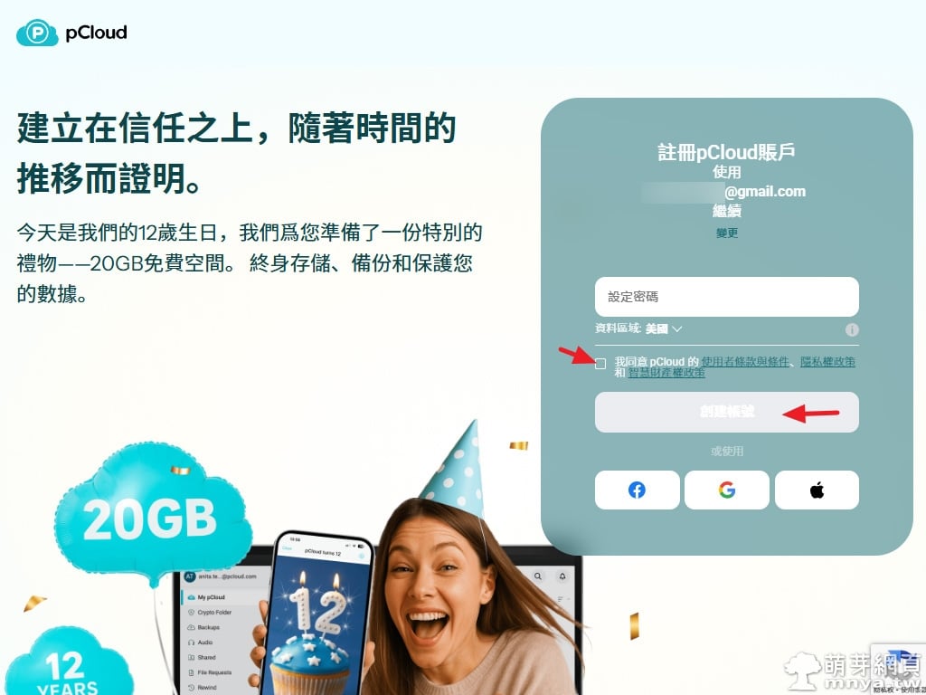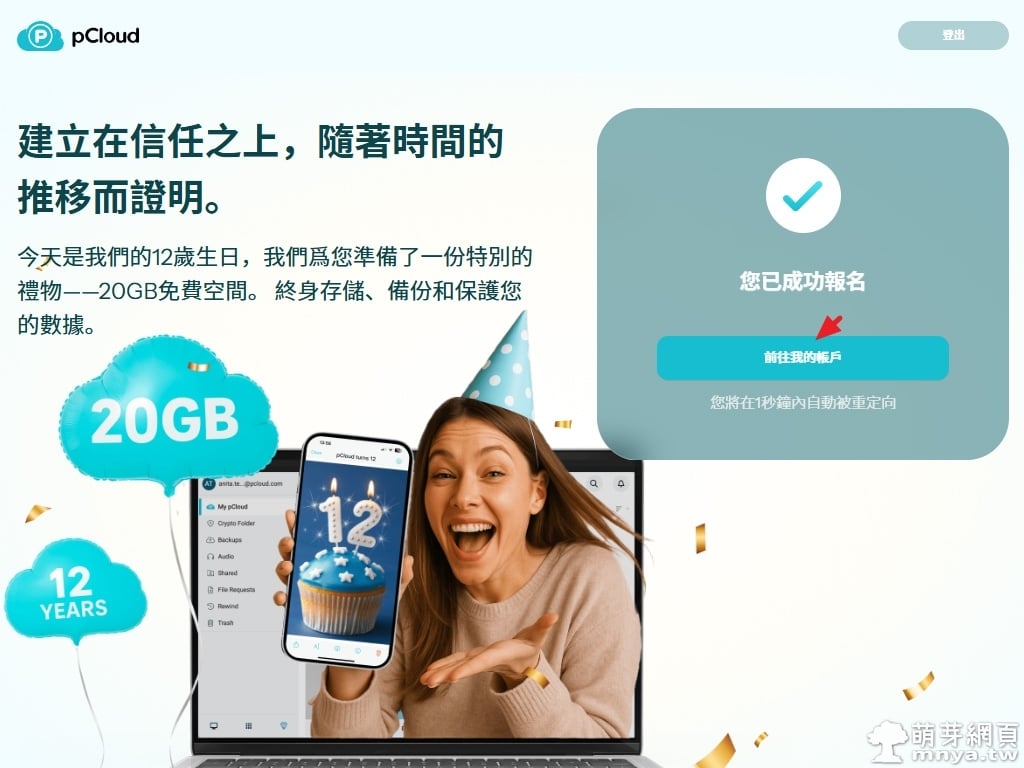今年適逢 pCloud 12 週年,官方特別推出優惠活動:新用戶註冊即可免費獲得 20GB 終身雲端空間。這不僅能幫助你儲存重要檔案,更能確保資料備份與安全性。對於習慣多裝置作業的朋友來說,pCloud 也支援桌面版與行動版應用程式,讓你隨時隨地管理檔案。