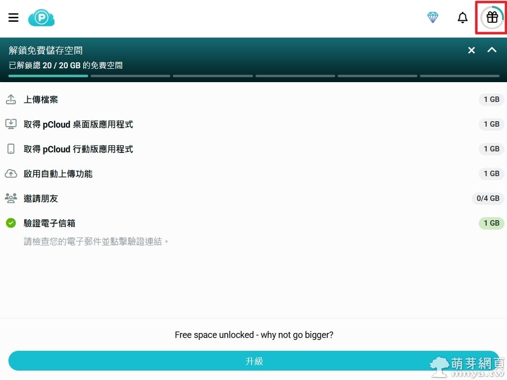 ▲ 在儲存空間解鎖頁面,你會看到 20GB 免費空間已經啟用。