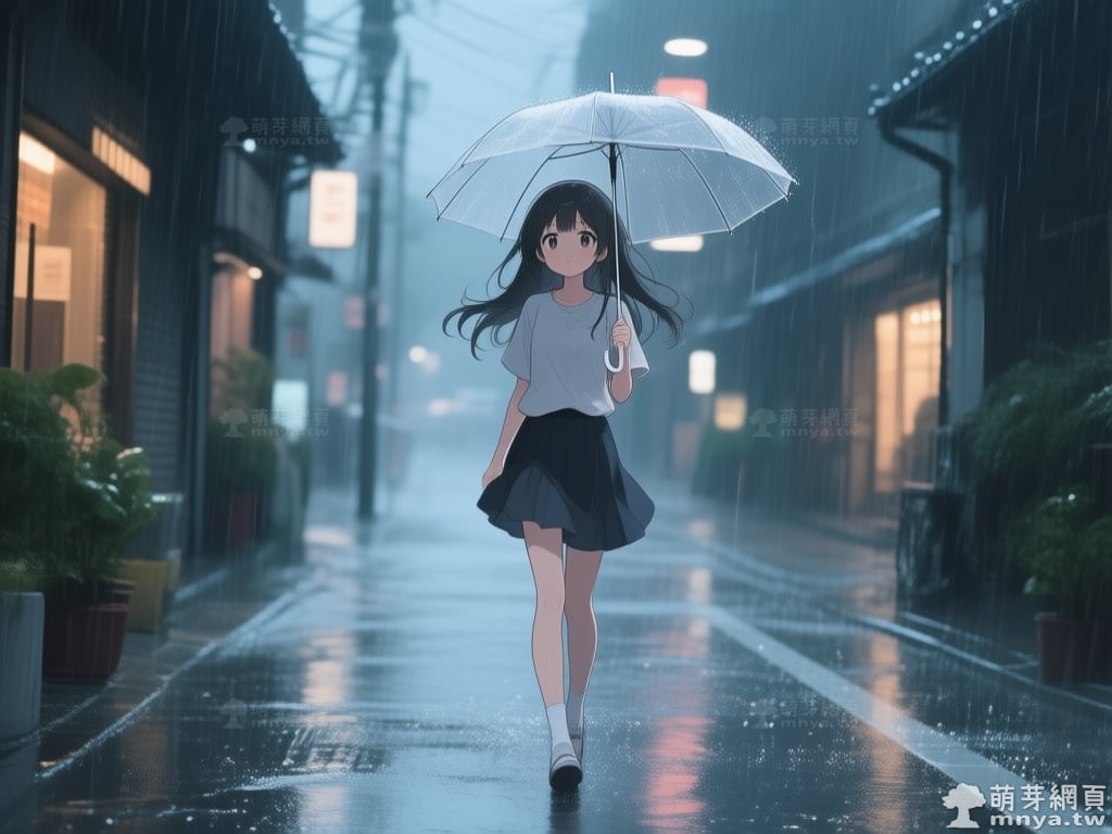 2. 動漫少女撐著雨傘,走在細雨綿綿的街道上