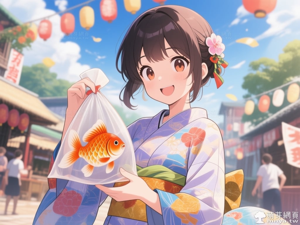 3. 動漫少女穿著和服,在夏日祭典上拿著金魚袋微笑