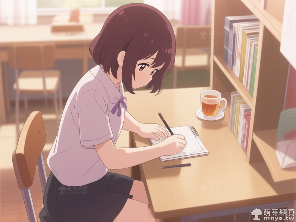 4. 動漫少女坐在書桌前,專心地寫日記,桌上擺著一杯熱茶