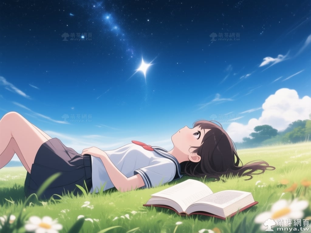 5. 動漫少女躺在草地上,仰望星空,身旁放著一本翻開的書