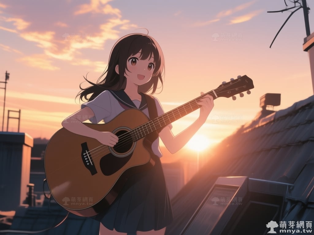 6. 動漫少女抱著吉他,在夕陽下的屋頂彈奏歌曲
