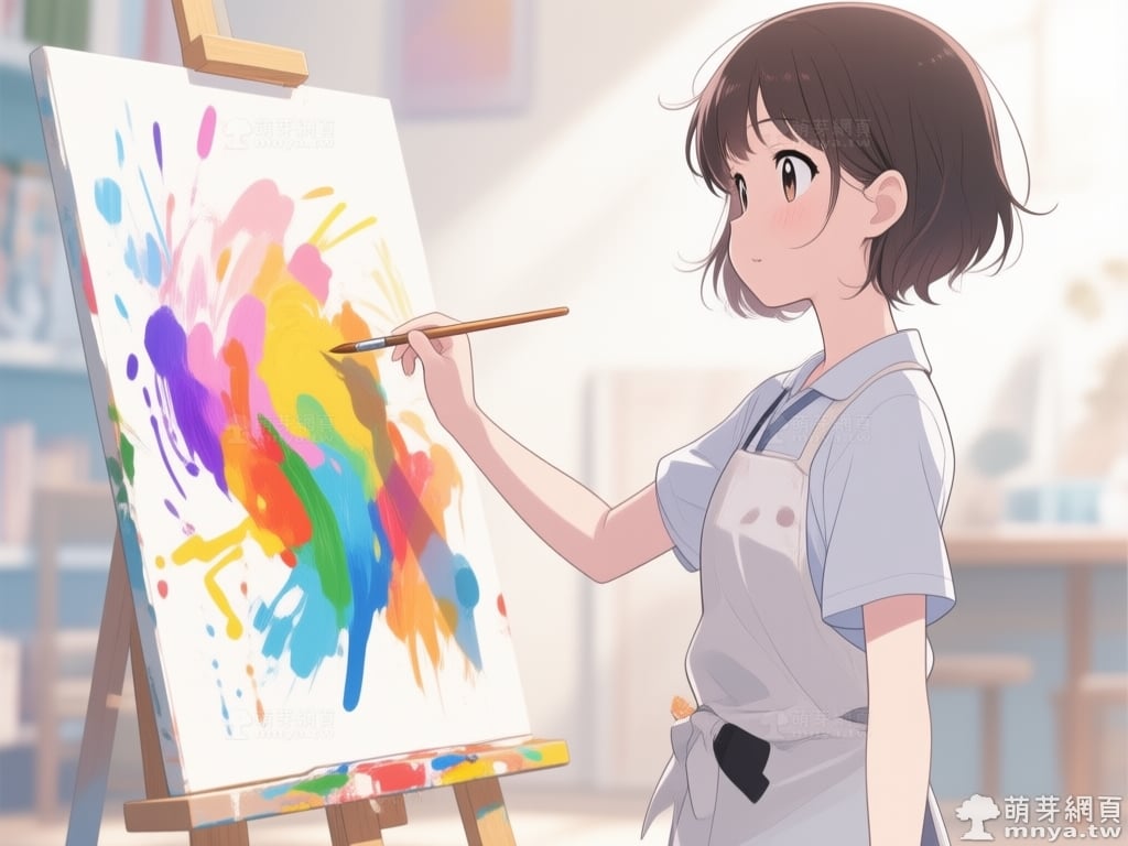 9. 動漫少女拿著畫筆,在畫布前專注地創作繽紛的圖畫