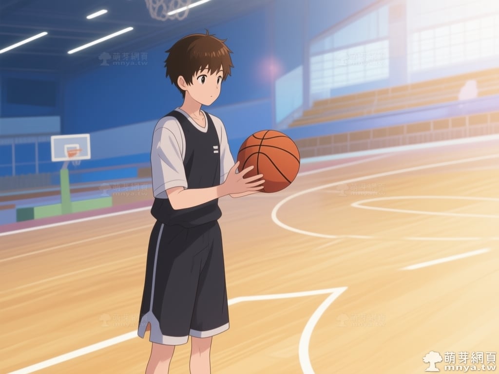 1. 動漫少年站在籃球場上,手中握著籃球,準備投籃