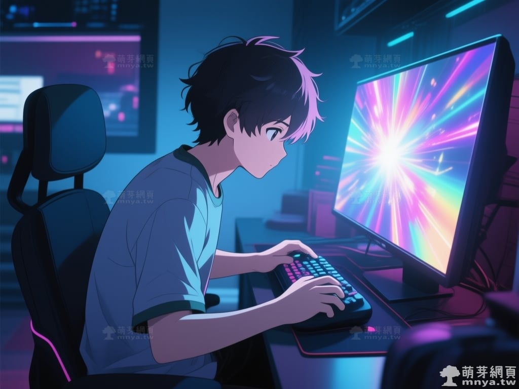 2. 動漫少年坐在電腦前,專注地打電玩,螢幕映照出五光十色的光芒