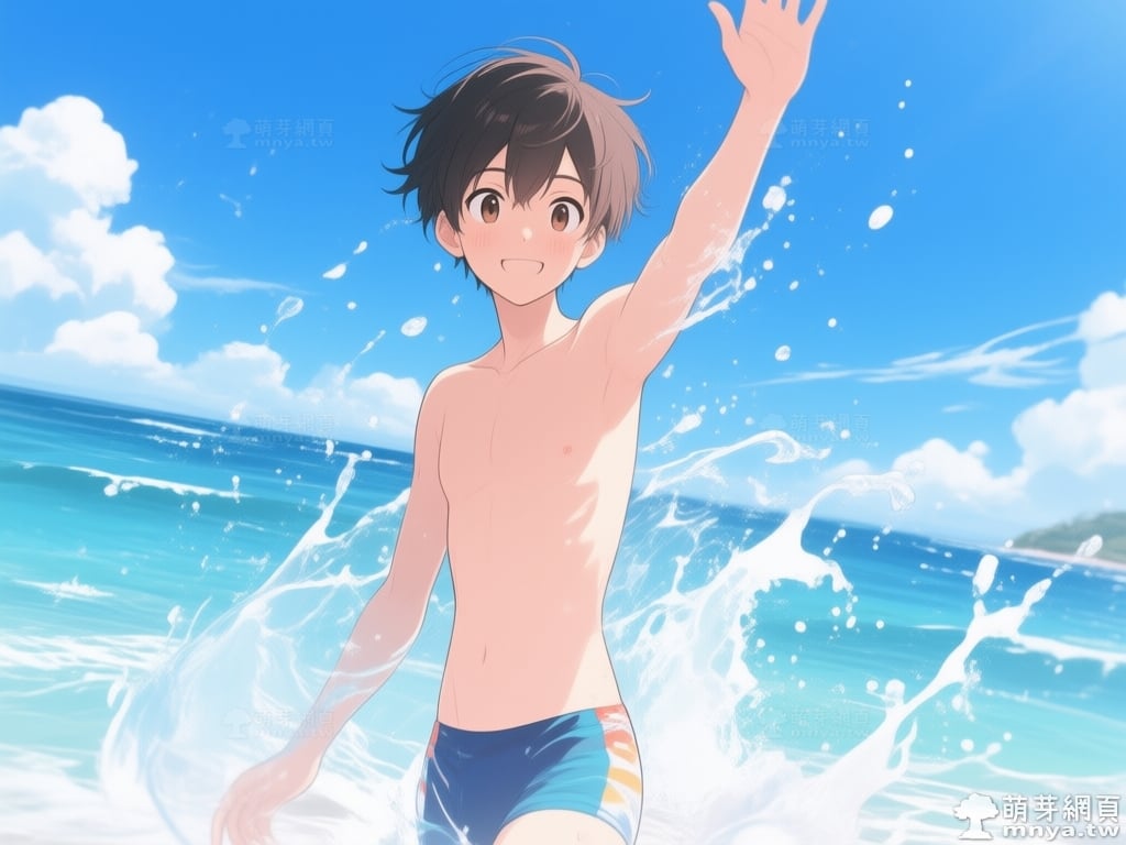 3. 動漫少年穿著泳裝,在海邊揮手,身後浪花翻湧