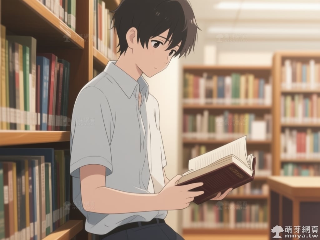 ▲ 少年在圖書館翻閱厚重小說,書架細節與環境氛圍真實,整體畫面安靜且沉穩。