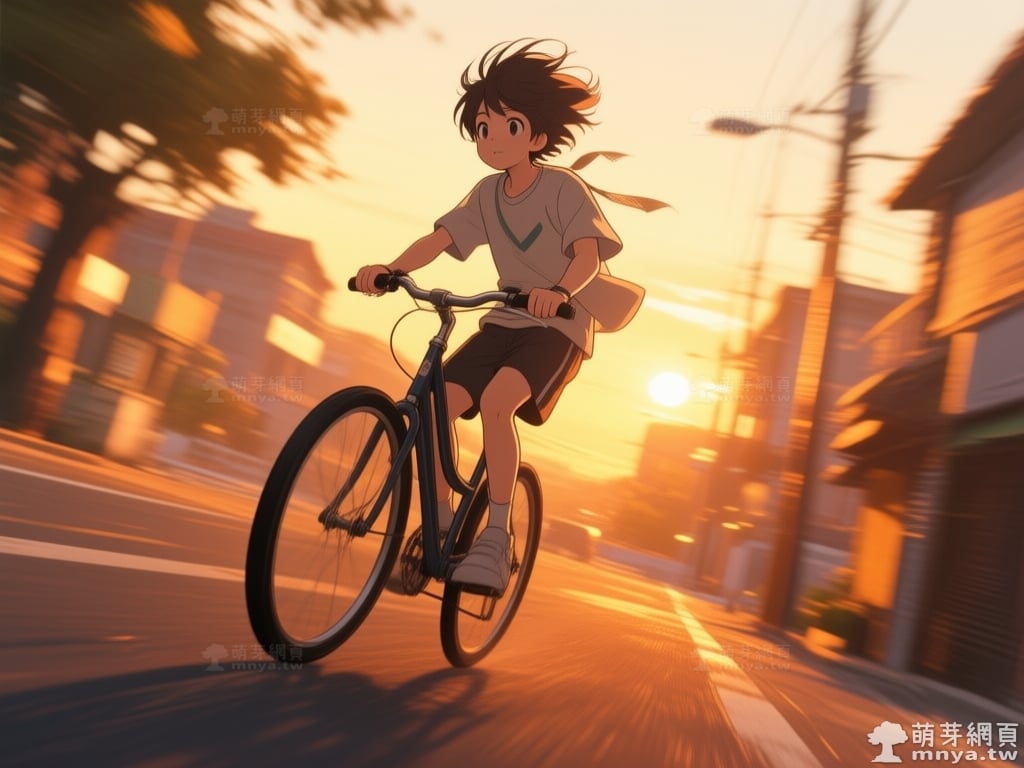 5. 動漫少年騎著單車,在黃昏的街道上飛馳,風把頭髮吹得凌亂