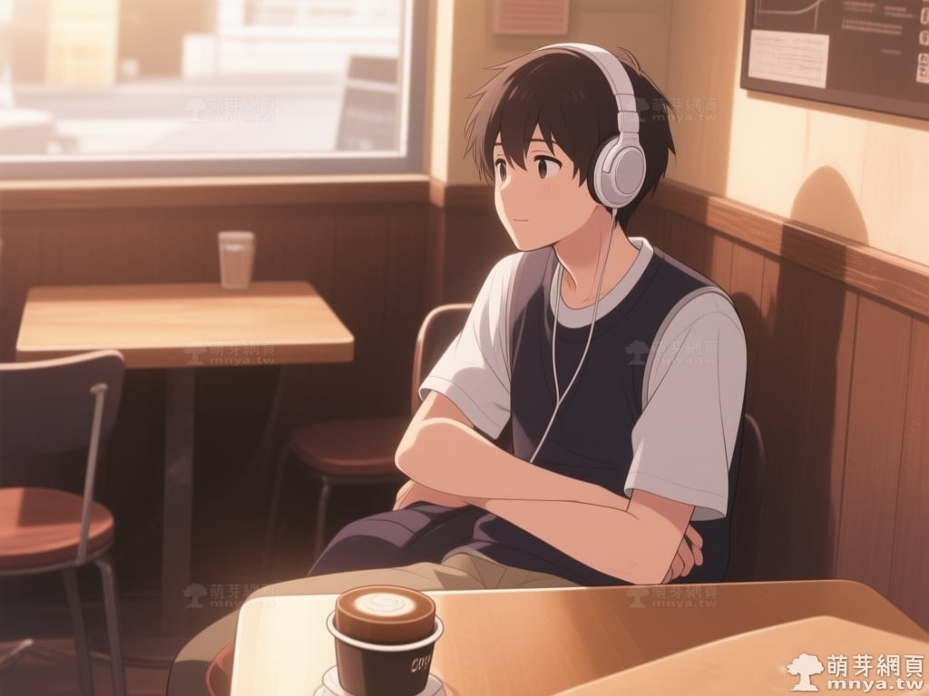 ▲ 少年戴著耳機在咖啡廳靜靜聽音樂,光線柔和,場景氛圍溫暖,適合表現日常的悠閒感。