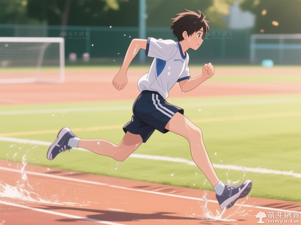 7. 動漫少年穿著運動服,在操場上奔跑,汗水閃爍著光芒