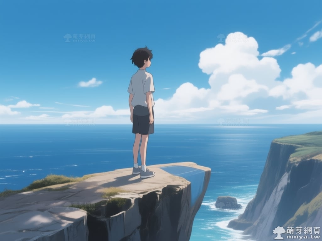 ▲ 少年站在懸崖邊眺望海平線,天空與雲層層次鮮明,整體構圖富有張力與孤獨感。