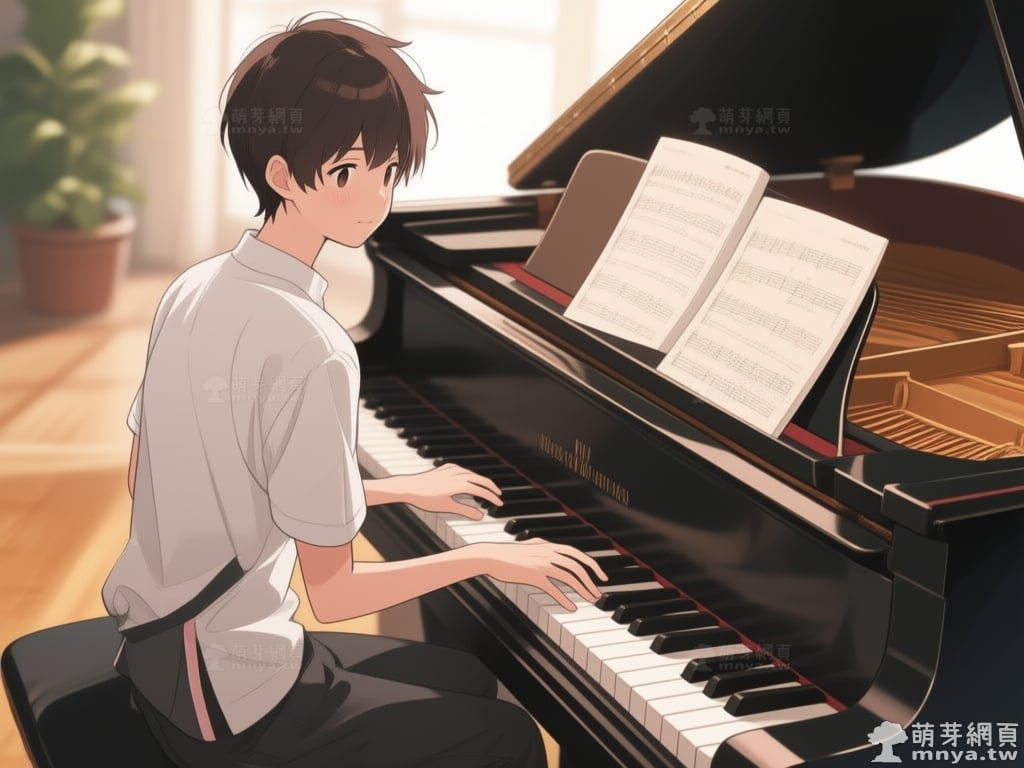 9. 動漫少年坐在鋼琴前,手指輕快地彈奏優美的旋律