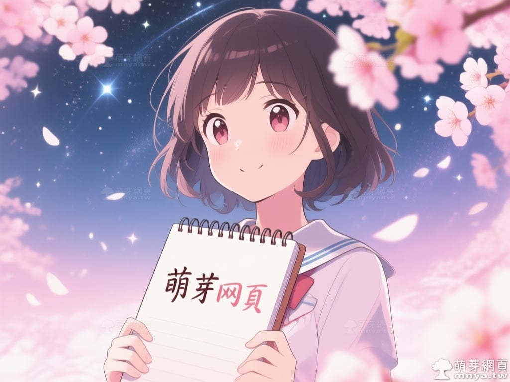 1. 夢幻風格:「動漫風格,一位甜美日式少女,手捧著寫有『萌芽網頁』字樣的筆記本,背景是粉嫩櫻花與閃亮星空,散發著希望與溫暖的氣息。」