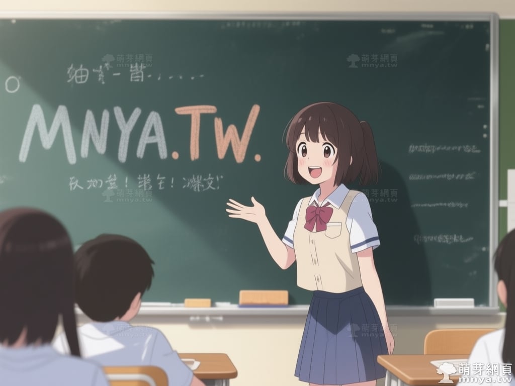 2. 校園青春風:「動漫風格,甜美日式少女穿著清新制服,黑板上大大寫著『MNYA.TW』,她笑著向同學介紹網站的特色,充滿青春行銷的力量。」
