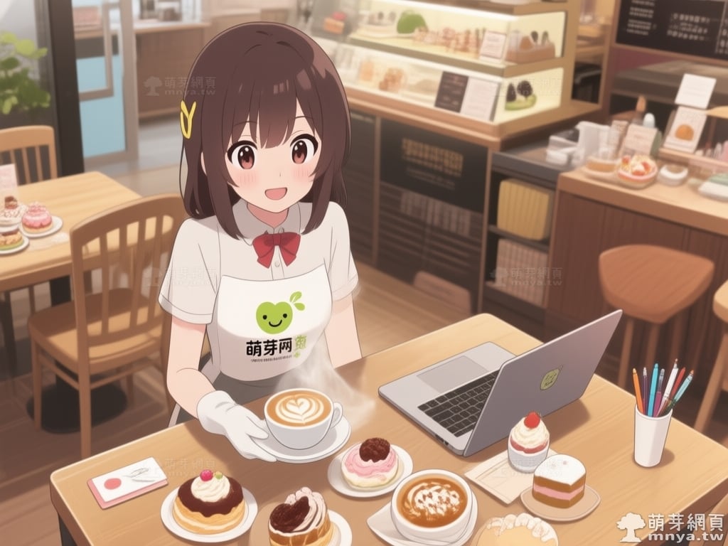 3. 甜點咖啡廳:「動漫風格,少女在咖啡廳端出印有『萌芽網頁』字樣的拉花拿鐵,桌上擺滿甜點與筆電,象徵用美味與可愛方式推廣品牌。」
