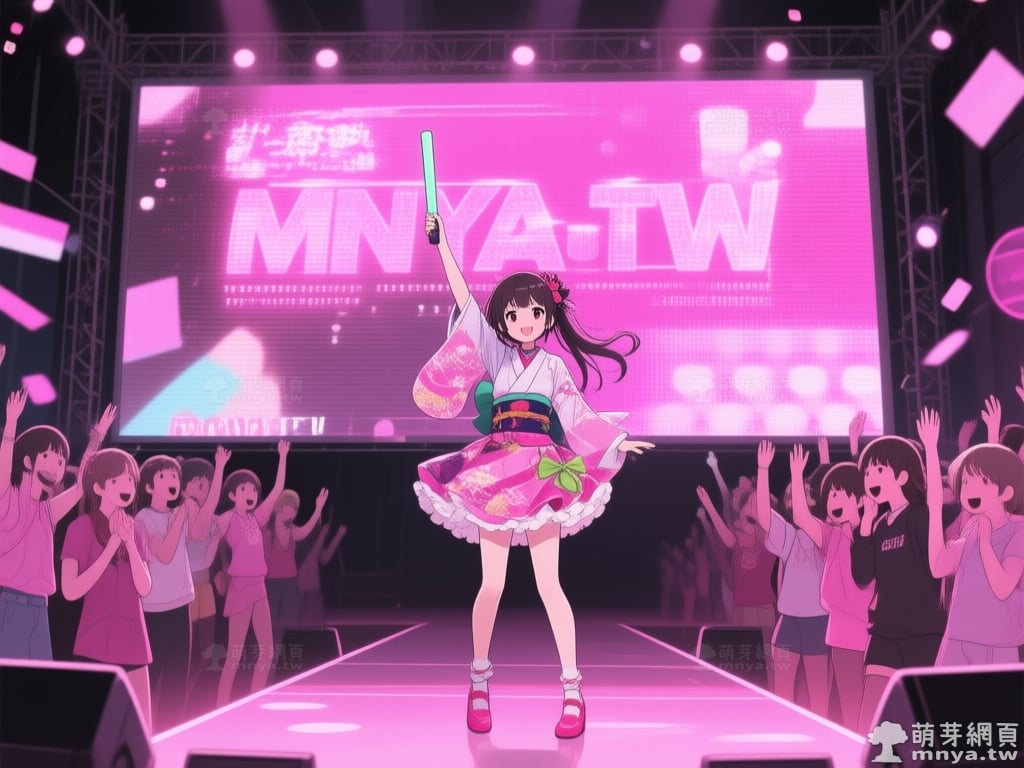 ▲ 偶像少女站上舞台,LED 螢幕上「MNYA.TW」字樣明亮清晰,粉絲應援氣氛熱烈。