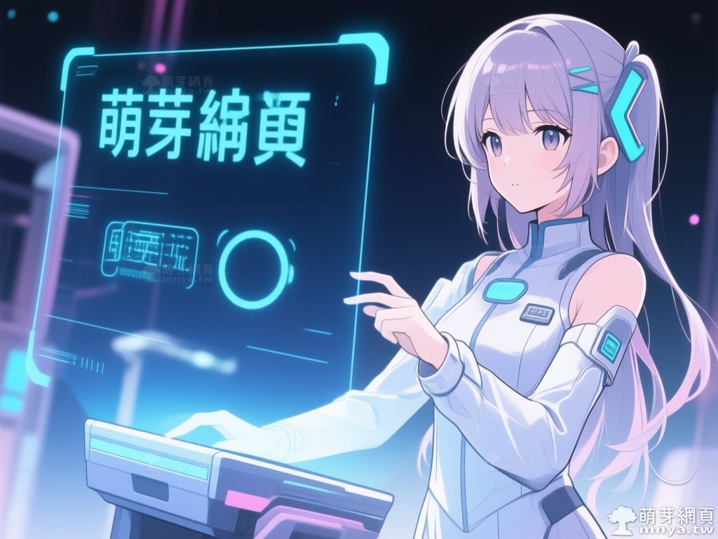 5. 科技未來感:「動漫風格,身穿未來感制服的甜美少女,操作著全息投影,投影上大大顯示『萌芽網頁』,象徵高科技、專業又時尚的品牌宣傳。」