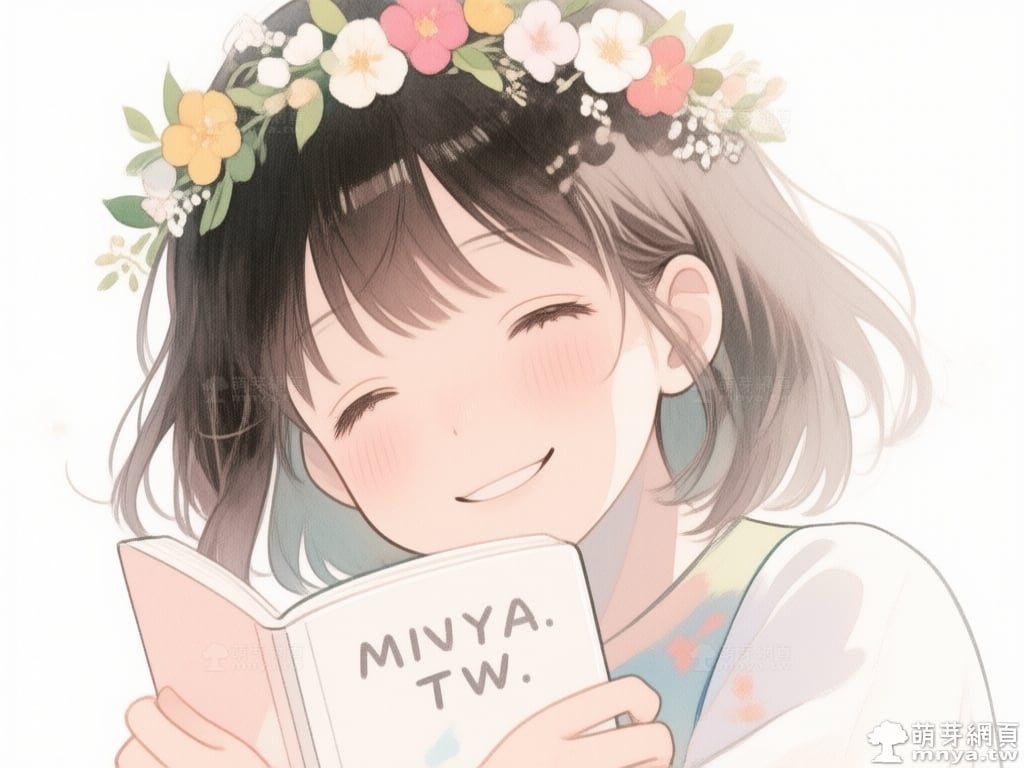6. 手繪插畫風:「動漫風格,水彩風格的日式少女插畫,頭上戴著花冠,懷裡抱著一本寫有『MNYA.TW』的書,溫柔笑容帶來文青行銷魅力。」