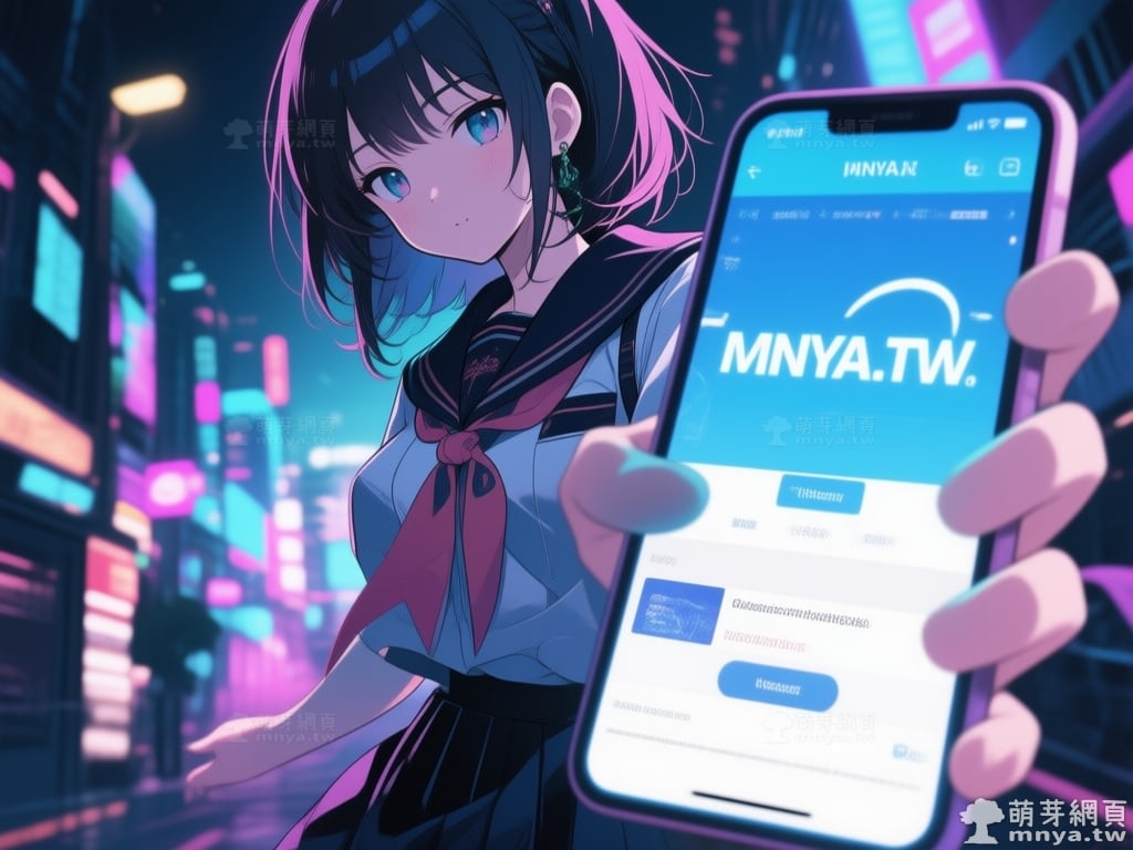 ▲ 潮流 JK 制服少女舉起手機,螢幕上顯示「MNYA.TW」,搭配都市霓虹背景,十分有時代感。