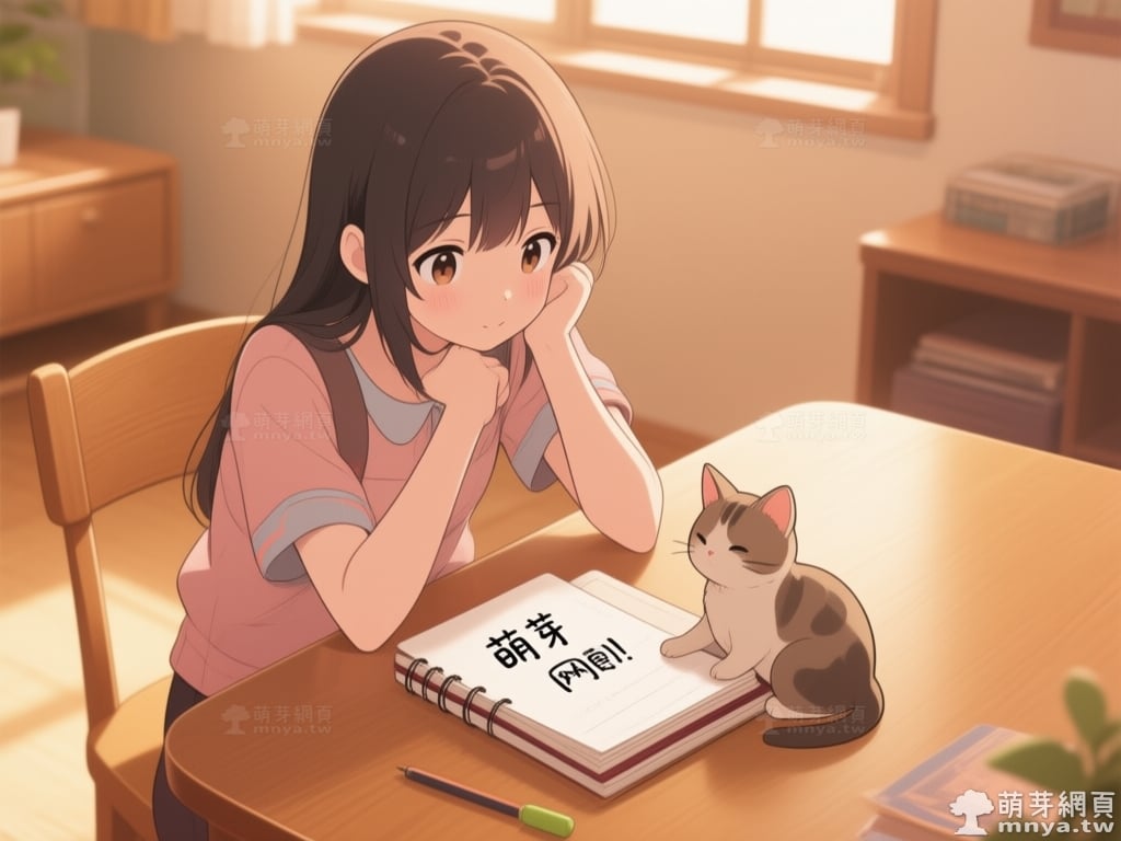 ▲ 溫馨房間裡的少女與小貓場景自然可愛,桌上的筆記本寫著「萌芽網頁」,這次一樣是「網頁」二字不夠完美。