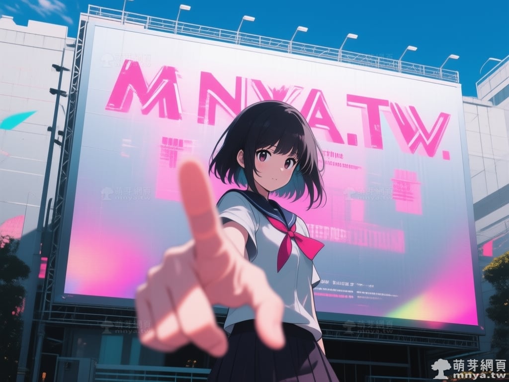 ▲ 廣告海報風構圖氣勢十足,少女手指向觀眾,背後大螢幕上的「MNYA.TW」字樣成為焦點。