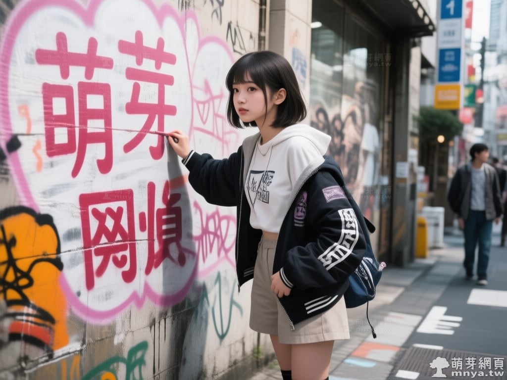 1. 街拍時尚風:「寫實風格,日系少女穿著時尚街頭服飾,在澀谷街頭牆面塗鴉上漆有『萌芽網頁』,氛圍充滿青春潮流感。」