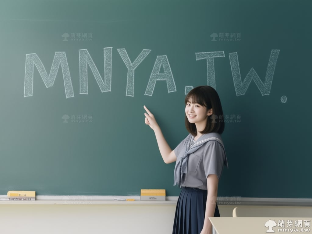 ▲ 校園黑板上的「MNYA.TW」字樣清晰,少女微笑指著板書解說,畫面自然生動,頗有校園宣傳的效果。