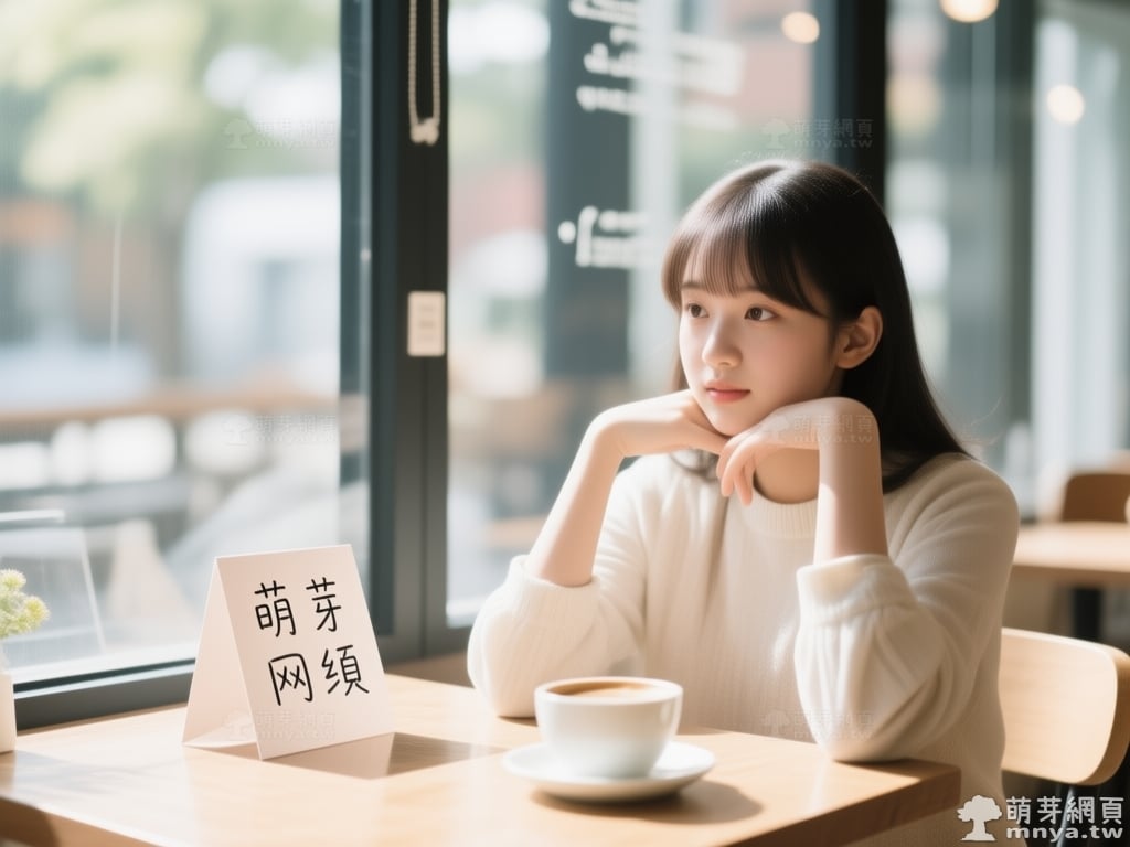 3. 咖啡廳文青風:「寫實風格,日系少女坐在咖啡廳窗邊,桌上手寫卡片清楚寫著『萌芽網頁』,陽光灑落帶來溫暖氛圍。」