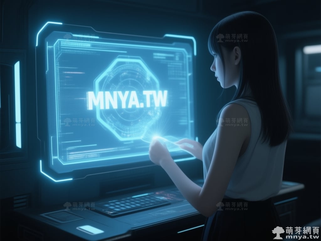 4. 高科技未來感:「寫實風格,日系少女操作全息投影螢幕,投影畫面中央顯示『MNYA.TW』,場景具有科幻科技感。」