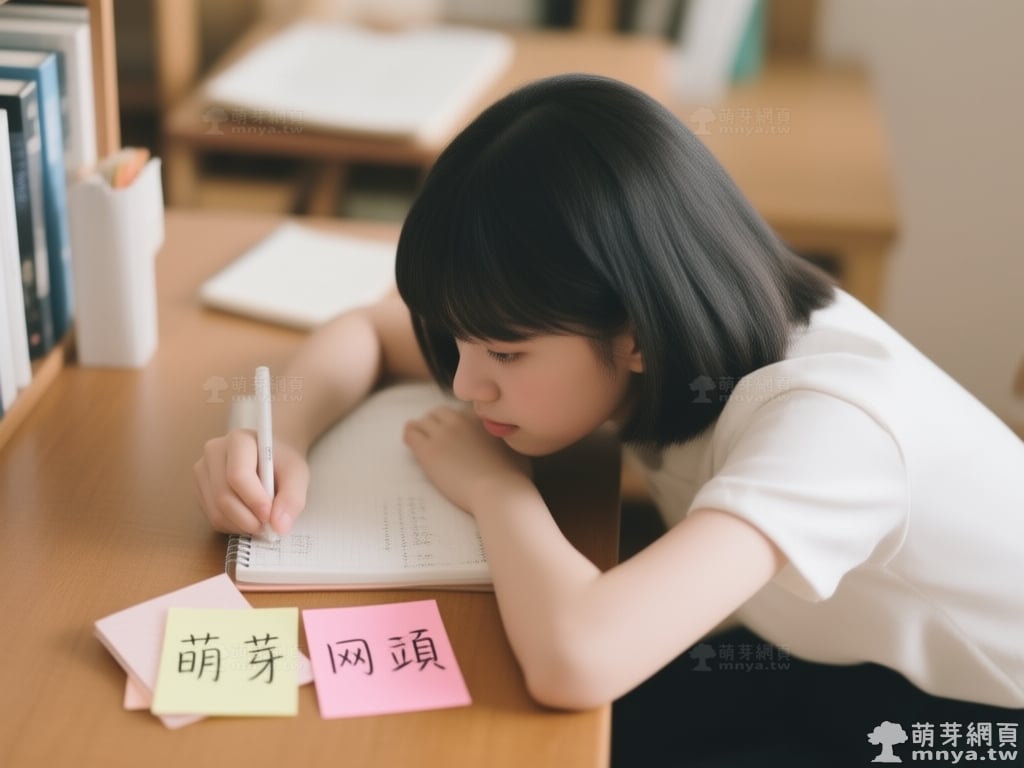 5. 手寫便條風:「寫實風格,日系少女趴在書桌上寫日記,桌上便條紙寫著『萌芽網頁』,場景溫馨而私密。」