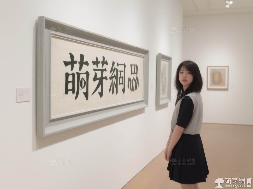 7. 插畫展覽風:「寫實風格,日系少女站在畫廊中,牆上展出一幅大型油畫,上面工整地寫著『萌芽網頁』,充滿藝術氛圍。」