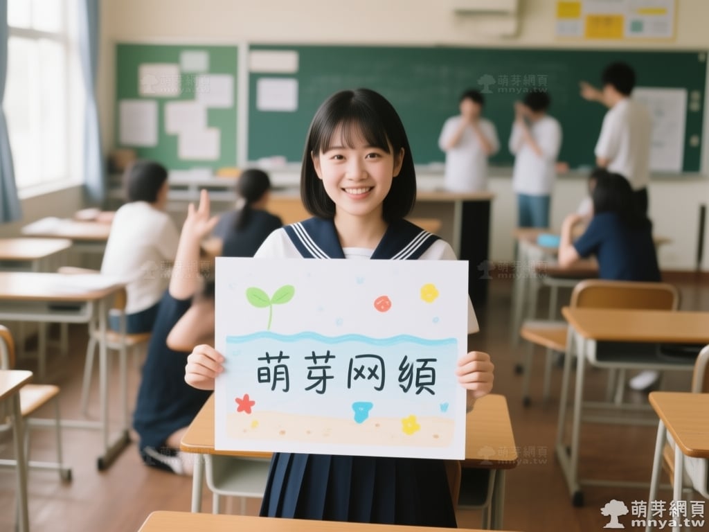 2. 黑板校園風:「寫實風格,日系女學生站在教室黑板前,粉筆字大大寫著『MNYA.TW』,她指著黑板微笑解說。」