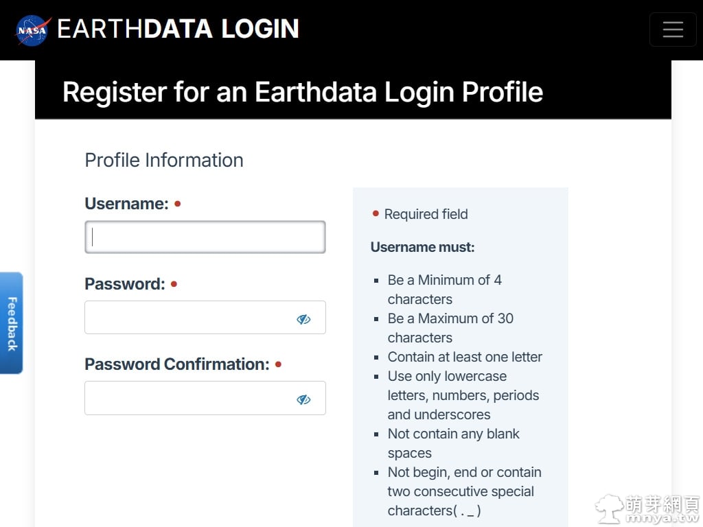 ▲ 註冊 NASA Earthdata 帳號時,需要填寫基本資訊如帳號、密碼、姓名、電子郵件及所屬國家。密碼必須符合安全規範(包含大小寫、數字與特殊符號),確保資料存取的安全性。完成註冊並登入後,即可下載 SRTM 的 30 公尺解析度地形高程檔案。