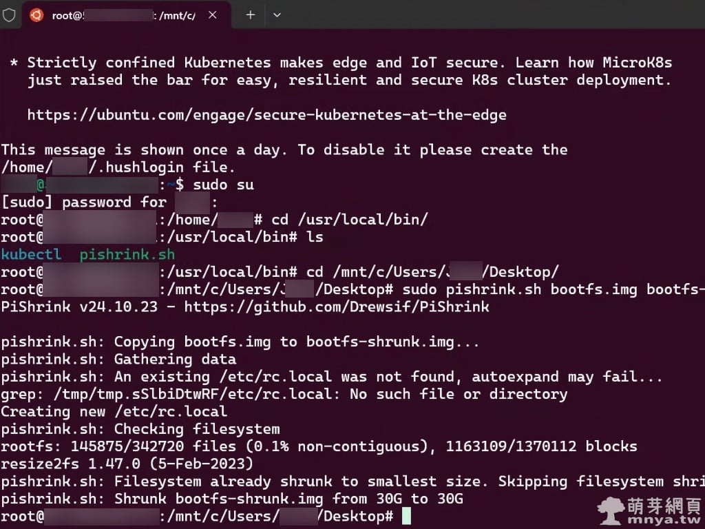 ▲ 在 Windows WSL 中透過 /mnt/c/ 進入桌面資料夾並執行 PiShrink 的實例。從輸出結果可以看到映像檔縮小與處理過程,操作方式與 Linux 完全一致。如果縮小後檔案仍很大,可再考慮透過 gzip 或 xz 進行壓縮。