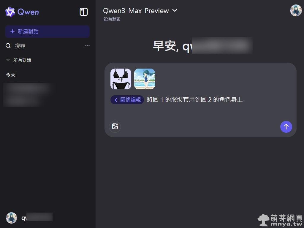 ▲ 透過 Qwen Chat,先開啟「圖像編輯」功能,你可以輸入指令,如:「將圖 1 的服裝套用到圖 2 的角色身上」,再上傳兩張參考圖片,要求 AI 將圖片中的角色換上指定的服裝,操作方式直覺而且快速。