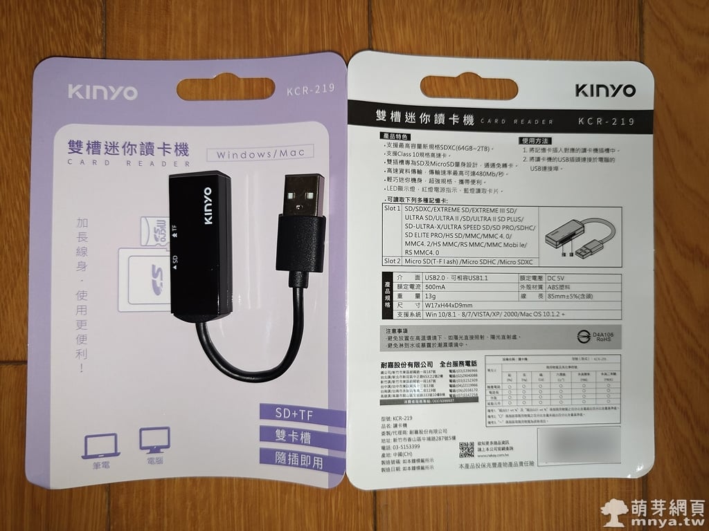 開箱這款【KINYO】迷你雙槽讀卡機 (KCR-219),第一眼看到就覺得它相當小巧,外包裝設計簡單明瞭,正面能直接看到讀卡機本體以及 USB 線,讓人一眼就明白它的用途。背面則詳細標示了支援規格與使用方式,可以看到它能對應 SD 與 MicroSD 兩種卡片,傳輸速度最高達 480Mb/s,對於平常需要大量讀取照片或影片的人來說,這樣的速度算是很實用。雖然是平價定位,但功能上卻沒有縮水,這點給人第一印象不錯。