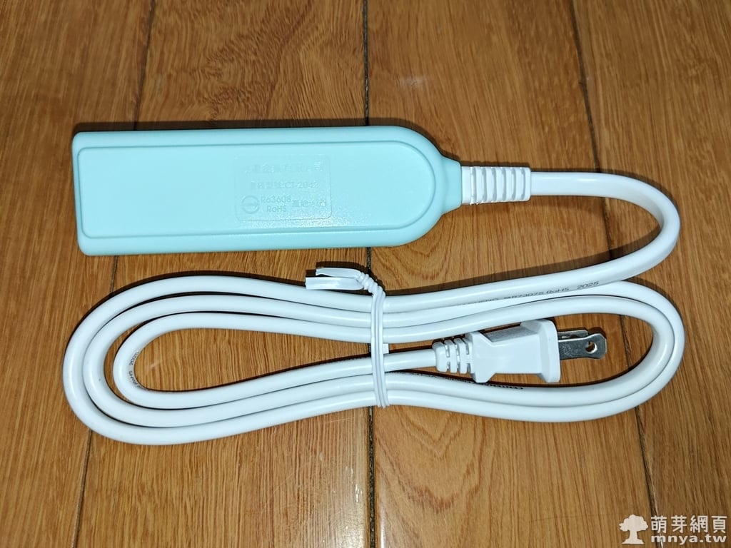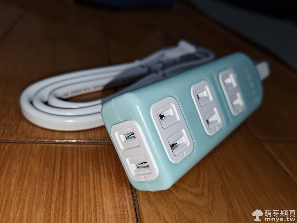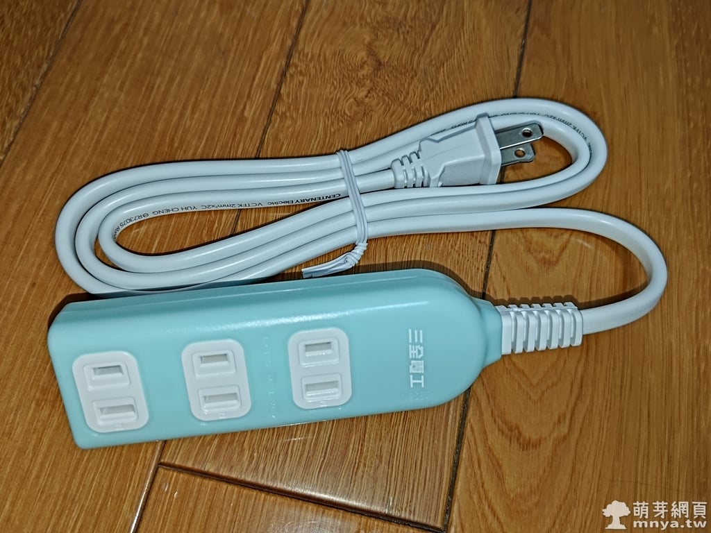 ▲ 拆封後可以看到實際的延長線本體,粉綠色的外殼看起來清爽耐看,線材長度為 1.2 公尺,適合桌面或小範圍空間使用。插頭與線材的銜接處有加強護套設計,減少折損風險。
